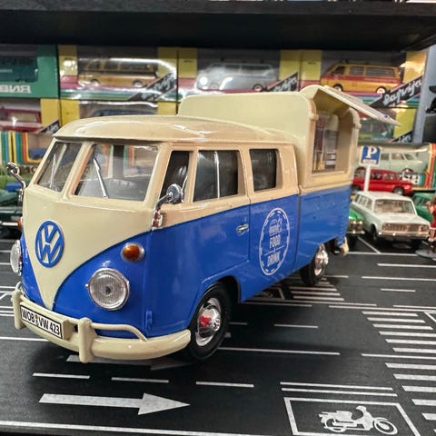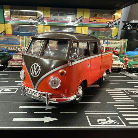 Volkswagen T1 minibuss lekebil i lilla og oransje. Modellen viser en klassisk T1-buss med flere vinduer, detaljerte støtfangere og felger. Passer som samlerobjekt eller leke, og kan brukes som utstillingsmodell i hylle eller på skrivebord. Modellen er laget i hard plast og metall-lignende materiale med malt overflate.