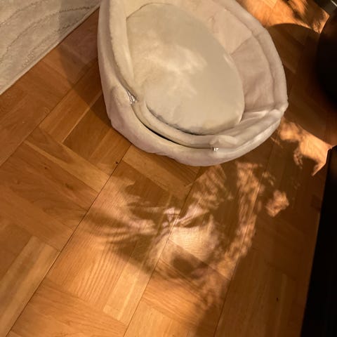 Petrebels kattehule med justerbare ben (de kan snues på). Lite brukt her da pusen heller ville ligge i sofaen. Avtagbar, rund pute som kan vaskes følger med. Egnet som liggeplass og gjemmested for katt innendørs.