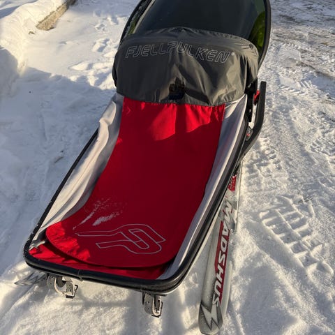 Fjellpulken barnepulk i rød farge. Pulken har trekk med vindu foran som skjermer barnet mot vær og vind. Den leveres med drag og seler for trekking.