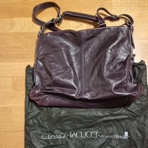 Fin skulderveske fra det Norske designmerket Moo .Pent brukt, men har noe bruksmerker som sees på bilde. Kan sikkert få en runde med skinnpuss, har ikke forsøkt å vaske vekk flekker.