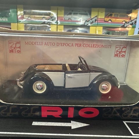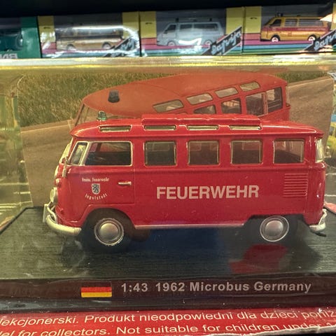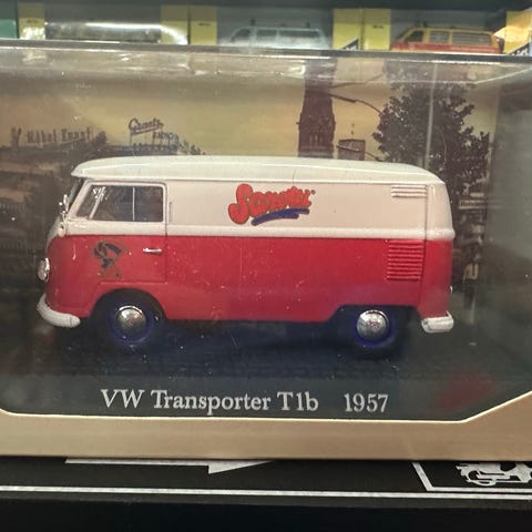 Volkswagen Transporter lekebil i metall, utført som varebil med blå og oransje lakkering og trykk med «transport-spedition» og «Flygfrakt». Modellen har gummihjul og detaljerte støpte understellskomponenter. Egner seg som samlerobjekt eller som lekebil på bilbane eller lekematte.