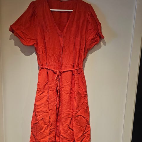 Kjolen er pent brukt. Str. XL. BrystmÄl fra armhule til armhule er 56 cm, og hel lengde fra skulder og ned er 147 cm. 65% polyester, 32% viskose og 3% elastan.