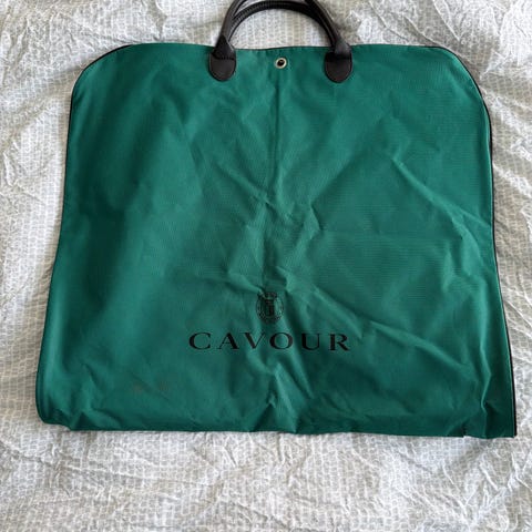 Selger en fin dresspose fra Cavour i kraftig grønt stoff. Håndtak i sort skinn og knapper som kan festes sammen og hull til kleshenger så den er enkel å transportere. Det er også en praktisk lomme hvor man kan legge kontaktdetaljer.
