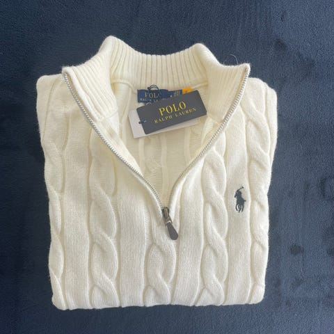 Selger en nydelig kremfarget kabelstrikk fra Polo Ralph Lauren med half-zip. Klassisk modell med brodert logo på brystet. Perfekt både til hverdags og litt penere anledninger