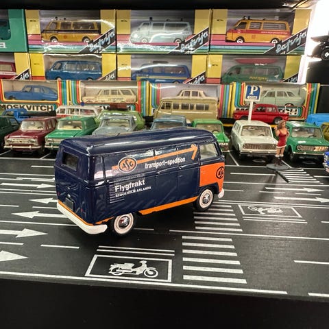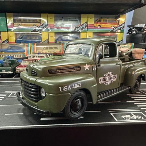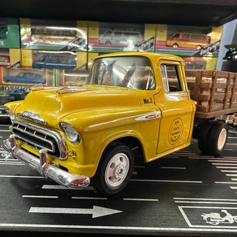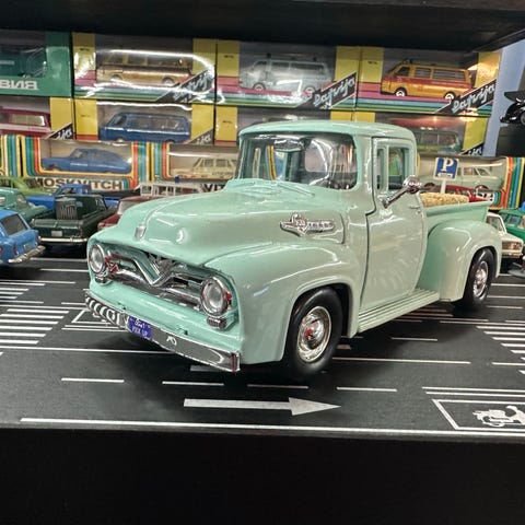 Modellbil av pickup lastebil i blå farge med kremfarget kapell. Sidene har trykk med «Flower Shop»-motiv. Modellen står på en bakgrunn med andre samlebiler og er egnet som samlerobjekt eller utstillingsmodell. Detaljert utførelse med hvite dekkkanter og åpning bak på lasteplanet under kapellet. Metall/Plastik