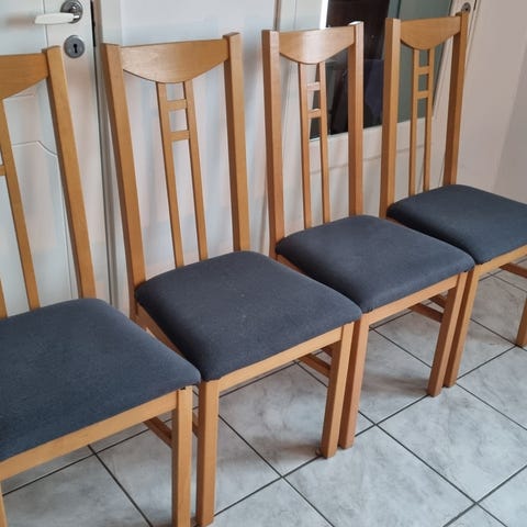 Selger 6 stk kjøkken-/spisestoler da vi har kjøpt nytt. Veldig gode å sitte i, velourstoff i rygg og sete.