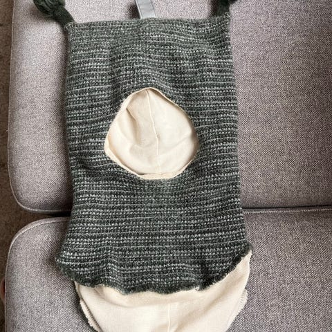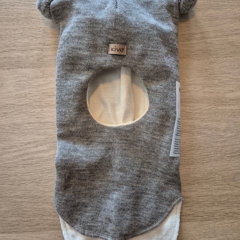 Kivat balaclava i str 3 og 100%ull og med 2 små dusker. Lys grå og mørk grønn i farger.