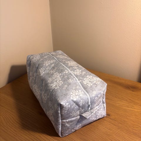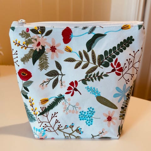 Toalettmappe/sminkepung med blomsterprint i flere farger på lys bakgrunn. Vesken har glidelåslukking øverst og innside i ensfarget stoff. Egnet til oppbevaring av toalettartikler, sminke eller småting på reise og hjemme. Str er ca 18x20 cm. Se også mine andre annonser. Samsender gjerne. Dersom du ikke ønsker å bruke fiks ferdig så ta kontakt. Sender da på billigste måte med posten når kjøper har vippset sum for varen pluss porto.