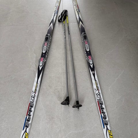 Madshus Classic Touring MGY+ langrennsski på 200 cm med Rottefella binding. Klassiske turski med integrert smørefri fell-/mønstret såle (MGY+). Skiens design er i hovedsak hvit med sorte og røde detaljer. Rottefella-bindingene er montert på skiene. Egnet til klassisk langrenn og turbruk på preparerte løyper. Det følger også med et par staver av typen Cape Elite aluminium, som passer til klassisk langrenn. Er kun brukt en gang.