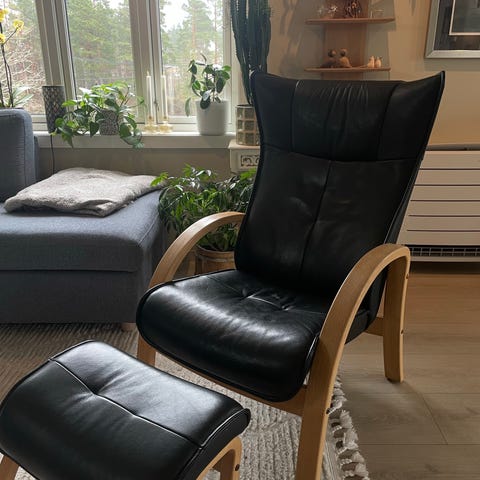 Flott designstol fra Brødrene Andersson. Modellen heter Chic og har gyngefunksjon. Følger med skammel. Stolen har stått på en hytte og er således svært lite brukt. Kjøpt ny på Møbelringen i Fredrikstad i 2022. Nypris for kun stol 26000,-
