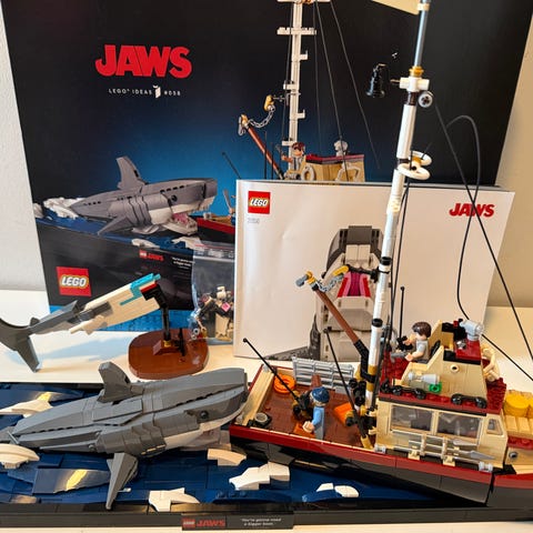 LEGO Ideas Jaws byggesett. Settet viser en båt og en hai inspirert av filmen «Jaws». Inneholder klosser til å bygge en detaljert båt med mast, dekk og utstyr, samt en stor hai og flere minifigurer. Egnet for bygging og utstilling for LEGO-samlere og filminteresserte.
