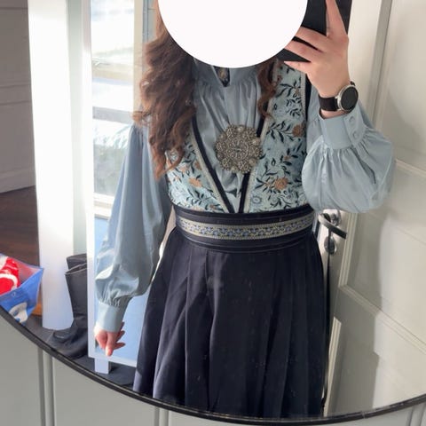 Stakk i bomullsdamask til festdrakt eller bunad. Rødrosa farge. Lengde 95 cm. Ingenting å legge ned. Livvidde ca. 80. Noe regulerbar når hekter til lukking sys på 😊 Del av et strandet syprosjekt som dessverre aldri ble ferdig festdrakt 😅