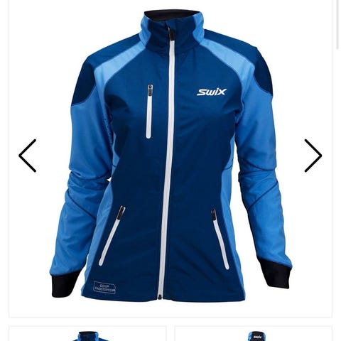 Swix langrennsjakke for dame i hvit og mørk blå farge. Jakken har hel glidelås i front, høy krage og to frontlommer med glidelås. Kontrastfelt på skuldre, ermer og rygg gir et teknisk preg.