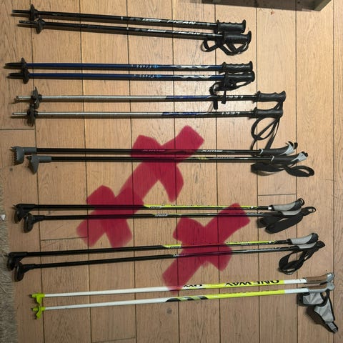 Pent brukte skistaver med klassiske stropper.