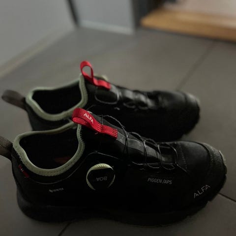 Alfa tursko i størrelse 37. Modellen er en ankelhøy tursko med snøring. Skoene har overdel i syntetisk materiale og tekstil, med mørkegrønn og grå fargekombinasjon samt lyse detaljer. Yttersålen har grovt mønster som gir godt grep på variert underlag. Polstret hælkappe og pløse gir støtte og komfort rundt ankelen. Egnet til tur og fritidsbruk på sti og lett terreng.