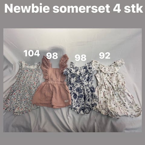 Newbie body og bukse for jente i størrelse 86 i rosa nyanser. Sett med flere langermede bodyer og kortermet body, samt én bukse. Bodyene har trykknapper i skrittet for enkel av- og påkledning. Buksen har strikk i livet og nederst ved bena. Klærne passer til hverdagsbruk for små barn i størrelse 86.