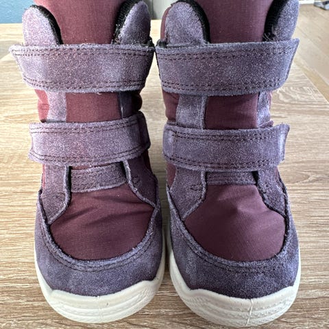 Viking vintersko med Gore-Tex for jente i størrelse 34 (det står 35, men de er mindre i størrelse). Skoene er i lilla farge med borrelåslukking foran. Overdelen er i tekstil og syntetisk materiale, med polstret kant og pløse for økt komfort. Grovmønstret yttersåle i gummi gir godt grep på underlaget. Egnet som vintersko til hverdagsbruk og uteaktiviteter i kaldere vær.
