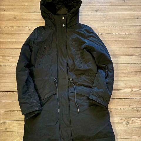 Jakken er svart og har hette, glidelåslukking med klaff foran og flere praktiske lommer. Innsiden har vattert dunfyll for ekstra isolasjon. Lengden går ned mot knærne for bedre beskyttelse mot kulde. Passer som ytterjakke i vinterhalvåret.