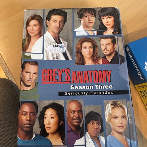 Grey’s Anatomy Season Two Part One DVD-boks. Inneholder første del av sesong 2 av TV-serien Grey’s Anatomy. Episoder 1–8 fordelt på flere DVD-plater, med bonusmateriale som blant annet slettede scener og annet ekstrastoff. Tekst og lyd følger standard DVD-utgivelse for serien.