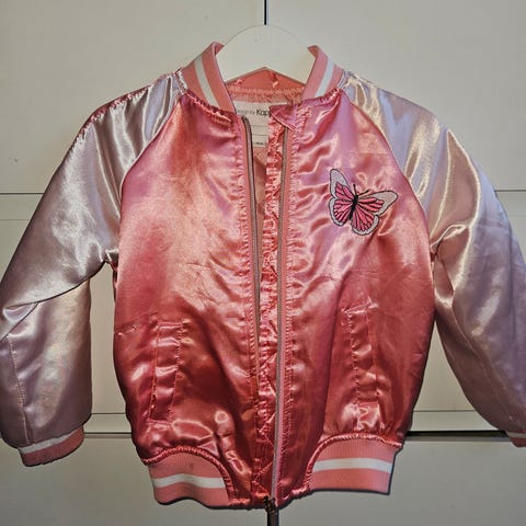 H&M jakke for barn i størrelse 92, beregnet for jente. Jakken er laget i polyester og har en blank, rosa overflate. Den har glidelåslukking foran og ribbekanter ved hals, ermer og nederkant. Passer som lett ytterjakke eller overtrekksjakke i mildt vær til sommeren.