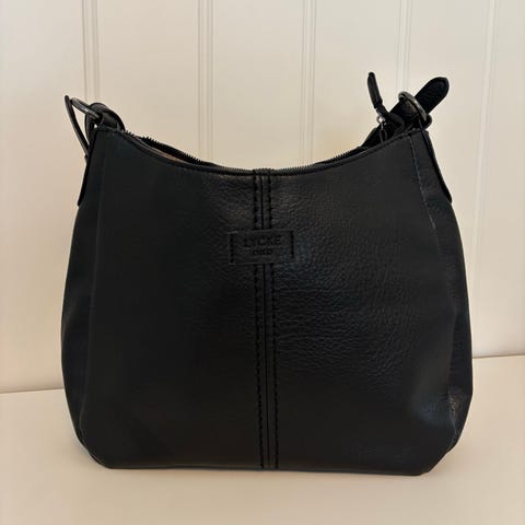 Markberg skulderveske for dame i svart skinn. Vesken har klaff med flettet skinn på fronten og glatt skinn på resten av vesken. Den har avtakbar og justerbar skulderrem samt kortere bærehank. På baksiden er det en glidelåslomme for småting. Innvendig hovedrom lukkes med klaff, og vesken egner seg til daglig bruk til nødvendigheter som mobil, lommebok og nøkler.