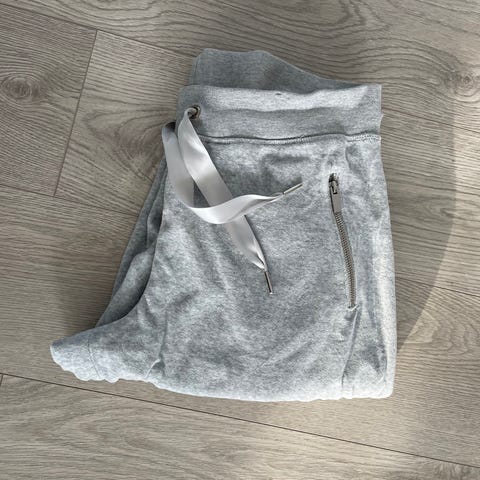 Va Vite jogge/kosebukse for dame i størrelse XL. Buksa er blå velur og har strikk i livet med knytebånd for justering. Den har glidelåslommer foran og ribbekanter nederst på bena.