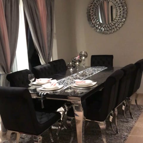 Sort glassplate og rustfrie stålben med klassiske detaljer