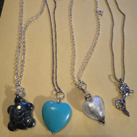 Håndlagde smykker av tørkede blomster, skjell, stener, perler og resin.