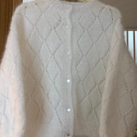 Tirillm strikkejakke str M. Mohair med hullmønster. Brukt en gang. Den er litt for stor for meg. Ny pris:3490.- Nå: 1200.-