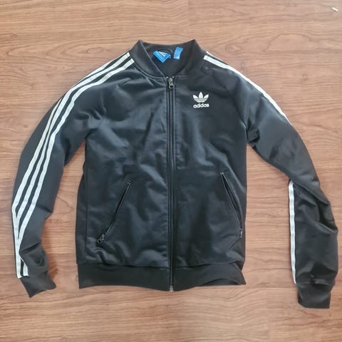 Jakken er svart med hvite Adidas-striper langs ermene og brodert Adidas Originals-logo på brystet. Se bilder som viser broderingen, denne finner du ikke så mange av da de fleste bare har trykk,