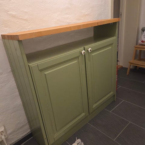 Nattbord brukt som sidebord/dekor, malt i en delikat lys grønnfarge. Rustikk utseende. Må hentes i Lillestrøm sentrum.