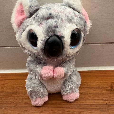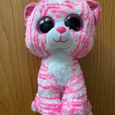 Ty Glamour kosedyr formet som en leopard i rosa og lilla mønster. Figuren har store, runde øyne, rosa snute og lilla detaljer på ører og hale. Mykt plysjmateriale egnet som koseleke eller pyntegjenstand på barnerom.