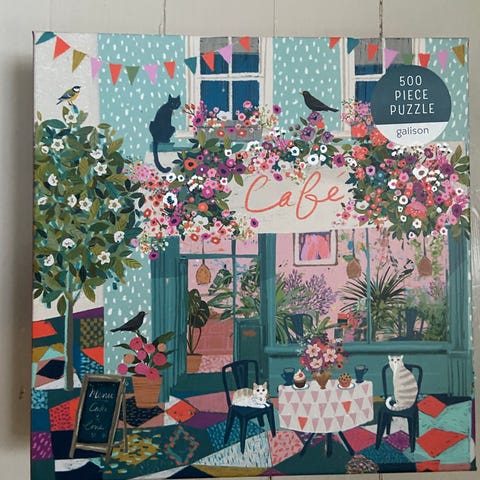 Slow Living puslespill med 1000 brikker. Motiv av en rund komposisjon med blomster i vase, kopp og bok med teksten «Slow Living». Puslespillet leveres i eske med brikkene samlet i plastpose. Egnet for ungdom og voksne som liker detaljerte motiv med blomster og interiørpreg.
