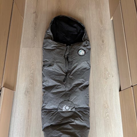Varm sovepose/vognpose i svart stoff med grått ytterstoff med hvitt, grafisk mønster. Innsiden er ensfarget svart. Posen har åpning i front og snøring øverst ved hodet. Egner seg til bruk i barnevogn for å gi ekstra varme og beskyttelse mot vind og trekk. Sælges billigt fordi den er godt brugt med synlige tegn på det.