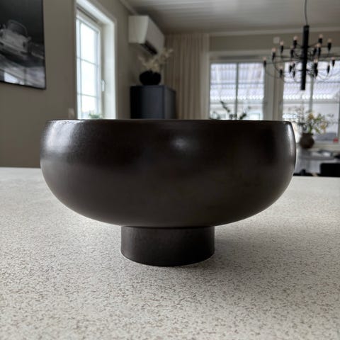 Audo Copenhagen sett med skåler i brun keramikk. Settet består av tre boller i ulike størrelser som kan stables i hverandre for enkel oppbevaring. Størelser: Ø: 17,5, 21,5 og 25,5 cm. Bollene har avrundet form og jevn, mørk overflate. Egnet til servering av salater, tilbehør eller snacks. Selges samlet. Må hentes i Fredrikstad.