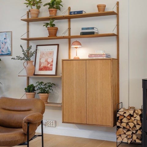 Stilren og solid vegghylle utført i heltre med gjennomført håndverksmessig kvalitet. Hyllen har et modulbasert og luftig uttrykk med vertikale stag og flere nivåer, som gir god fleksibilitet for oppbevaring og presentasjon.