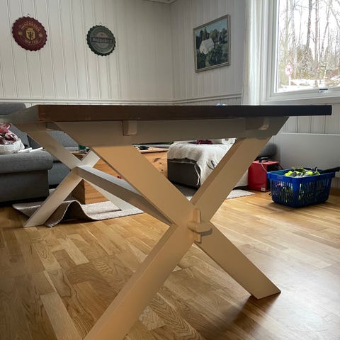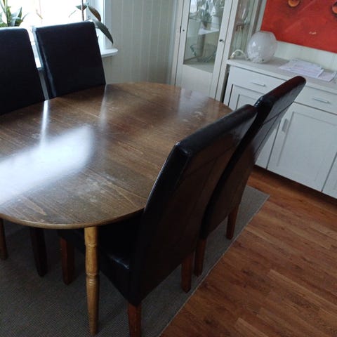 Spisebord i mørkebrunt heltre. Bordet er veldig solid og stødig, men har en del riper/bruksmerker og slitasje i lakken. Det følger med to bord klaffer (50 cm hver), som kan skrus på hver ende, bordet blir da 280 cm.
