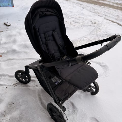 Yngri barnevogn med svingbare forhjul i grå tekstil. Vognen har justerbart sete med fempunktssele, avtagbar frontbøyle og stor kalesje. Håndtaket er trukket i imitert skinn og er høydejusterbart. Under vognen er det en romslig varekurv. Passer til ett barn og kan brukes til hverdagskjøring og trilleturer på variert underlag.