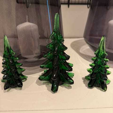 Glassjuletrær som pynter opp fint på lysfatet, eller sammen med glassnisser fra hadeland.