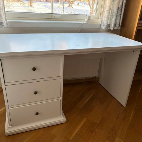 Selger et koselig skrivebord med to skuffer på venstre side og en turkis hylle på siden til høyre. Bordet har en del bruksmerker.