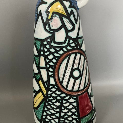 Keramikkvase med håndmalt landskapsmotiv i flere farger. Motivet viser blant annet trær, bygninger og naturdetaljer rundt hele vasen. Overflaten er glasert, og formen er klassisk rund med smalere åpning øverst. Egnet som pyntegjenstand eller til blomsteroppsatser på bord, hylle eller kommode. (Ai generert tekst, beklager). Laget av Ela Monsen. Ca 30 cm høy. Åpen for tilbud.