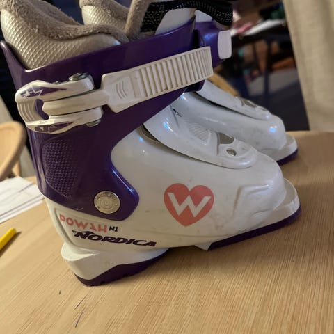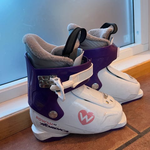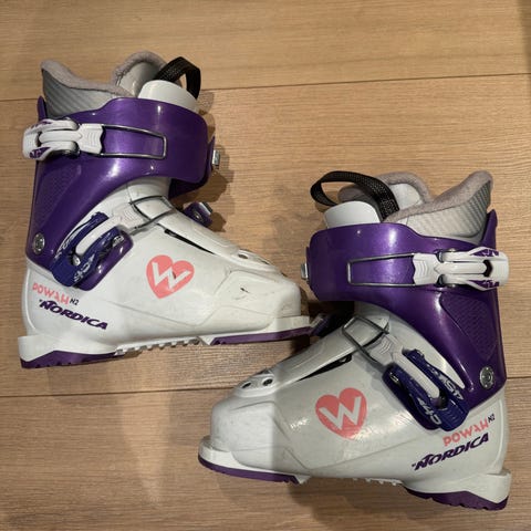 Atomic Waymaker alpinstøvler for barn i størrelse 235 mm. Støvlene er hvite med lilla detaljer og har justerbare spenner for god tilpasning til foten. Passer til alpint bruk for barn innenfor anbefalt skostørrelse 180–195 mm sålelengde (235 mm yttersåle).