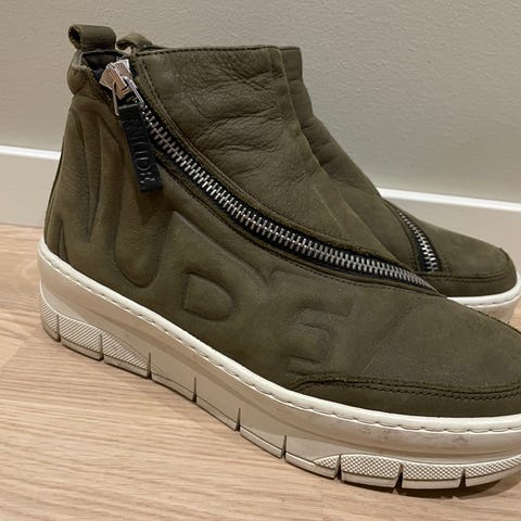 Nude of Scandinavia sneakers/joggesko i størrelse 38. Modellen har overdel i ulike gråtoner med kombinasjon av glatt materiale og semsket preg, samt hvite lisser. Skoene har kraftig, lys såle med brun detalj bak og hempe med «Nude»-logo på hælen. Egner seg som hverdagssko og fritidssko i sesonger der joggesko passer.
