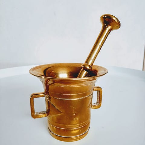Stor morter i messing. Vekt 2,250 kg inkl stang. Høyde 11,6 cm, diameter 12 cm. Ingen stempel / merking. I god stand.
