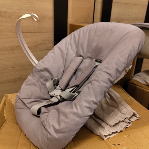 Pent brukt Stokke newbornseat i fargen lys grå, følger med stang til å henge leke i.