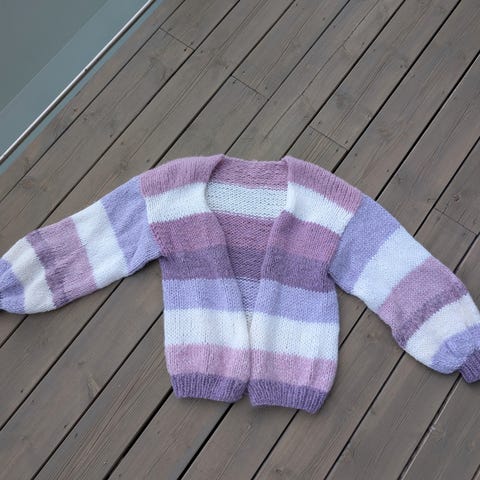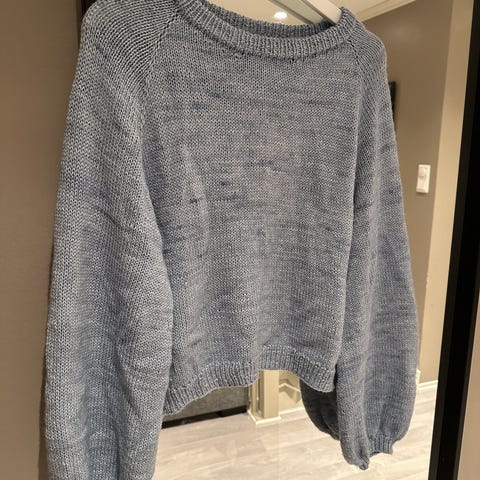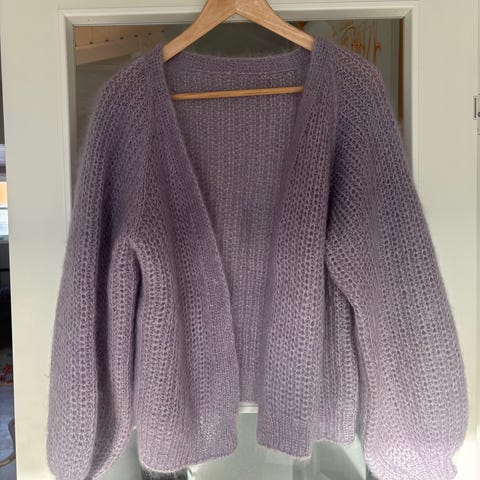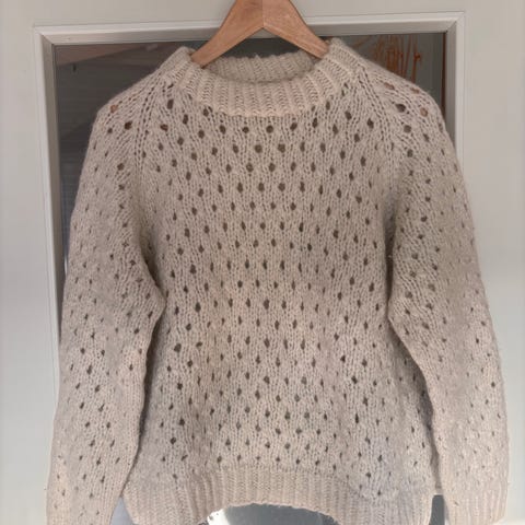 Hjemmestrikket Lykke Jumper av Spektakelstrik i størrelse M. Genseren er strikket i en tråd merinoull og en tråd soft silk mohair.