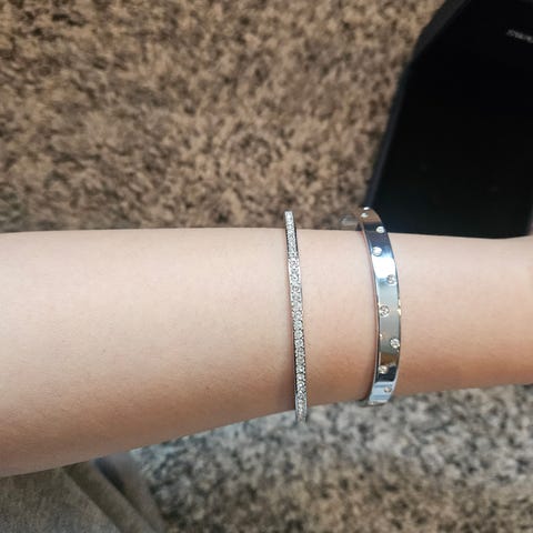 Accessorize armbånd for dame i stål med krystaller. Armbåndet er i blankt stål med en rad små, klare krystaller på fremsiden. Det har lukking som gjør det enkelt å ta av og på. Passer som hverdagsarmbånd eller til mer pyntede anledninger.