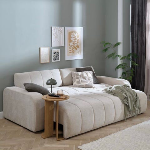 Sofaen har smarte løsninger med oppbevaring under sjeselongdelen og mulighet for å omgjøring til sovesofa.
