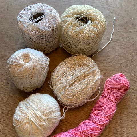 Pakke med nøster i ulike pene farger. Fargene inkluderer blant annet lys grønn, lys rosa, mørk burgunder, gullgul, lilla og rosatoner.