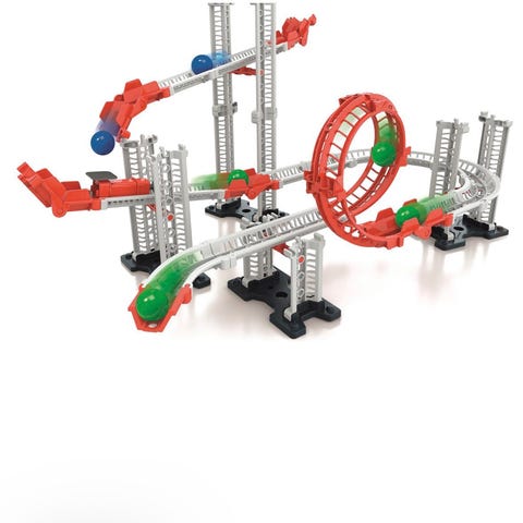 Bilbane med flere blå og oransje ramper, dinosaurfigur og ulike hinder. Banen består av plastdeler som monteres sammen til en nedoverbakke med flere spor og hopp.